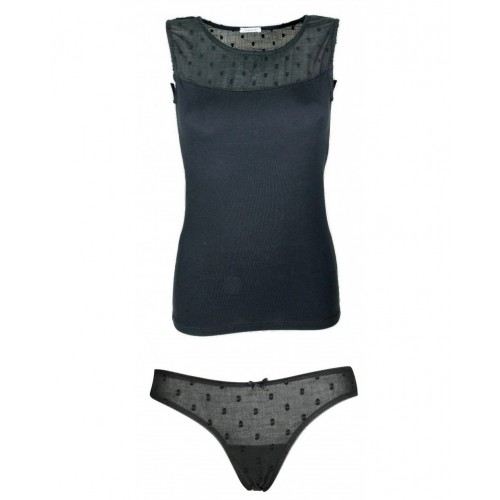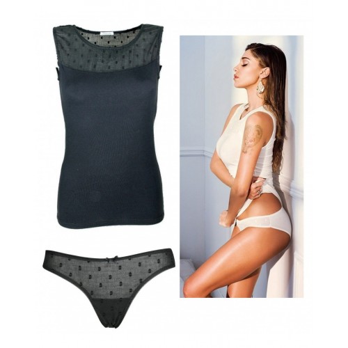 " Jadea art.4647 " è un Coordinato della linea Chic formato da una Canotta e uno slip, la sua composizione leggera ed elasticizzata è in cotone. La parte superiore della sua Canotta è lavorata in crepe a pois assieme al suo slip. Questo articolo è usato come Biancheria intima per la notte, ma nulla impedisce di usare la sua canotta come abbigliamento esterno grazie alla sua lavorazione.
