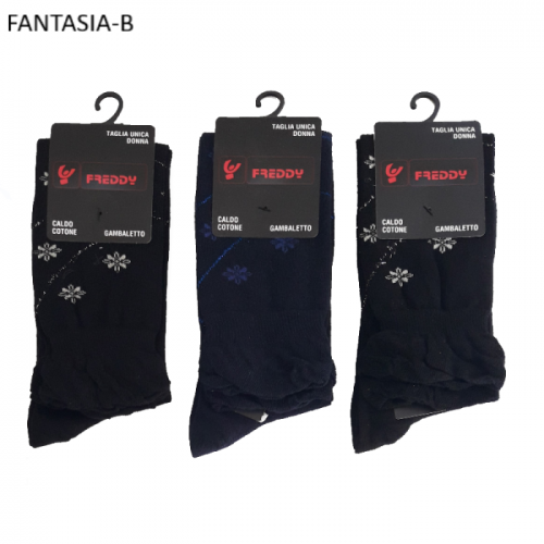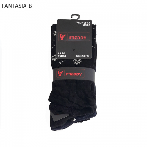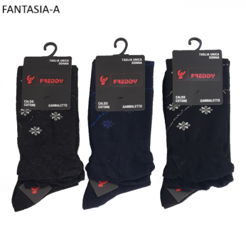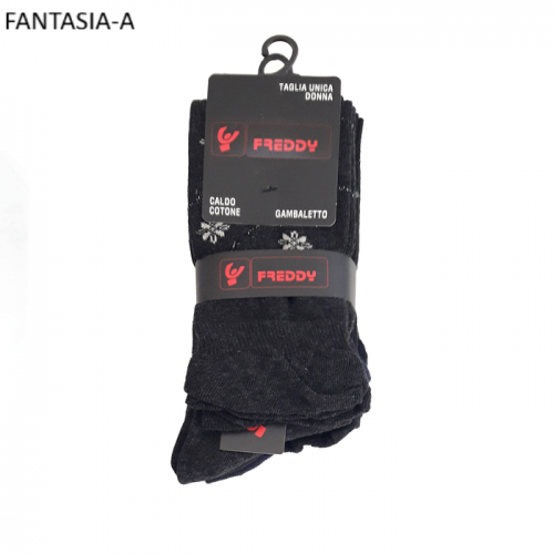 " Freddy ART.FD-023L " sono un gruppo di Calze lunghe a Gambaletto fino al polpaccio da donna in caldo cotone con piccola fantasia formato fiori con lurex assortite di colori. Queste calze sono prodotte con filati di cotone di altissima qualità, caratterizzate dal loro elastico morbido che da un effetto arricciato per via delle sue orlature e dal loro tessuto in caldo cotone che le rende soffici al tatto. Sono molto pratiche da indossare e danno un senso di confort al piede il quale viene tenuto caldo nelle stagioni rigide e fredde.