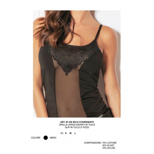 Top spalla stretta in microfibra con inserti in tulle trasparente e raffinato pizzo lavorato a motivo floreale.
