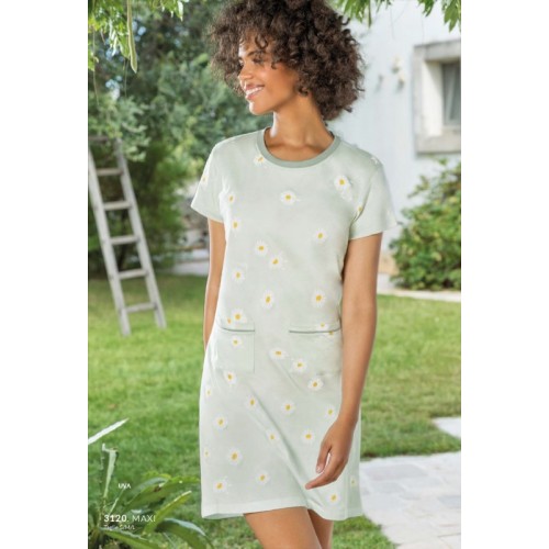 Scollatura a girocollo, con profilo scollo in colore uva a contrasto e tasche applicate; in manica corta con stampa fantasie margherite.
