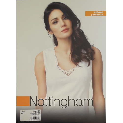 " Nottingham ART.VL4311BW " è un Vogatore ( Canotta ) da donna in cotone pettinato. Questa Canotta è prodotta con filati di cotone di altissima qualità che la rendono fresca al contatto con la pelle, ed è caratterizzata dalla sua lavorazione in raffinatissimo pizzo e dal suo formato a costina liscia che la rende bella sagomata al corpo.
