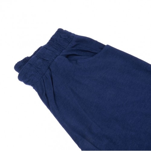 Pantaloncino blu con elastico in vita, 4 tasche (2 avanti e 2 dietro) in tessuto di jersey di cotone.