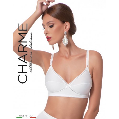 " Charme Art.Lady cross " è un Reggiseno della linea cotton classic non imbottito senza ferretto a incrocio classico in puro cotone con inserto fiocco in raso al centro seno e spalline regolabili.