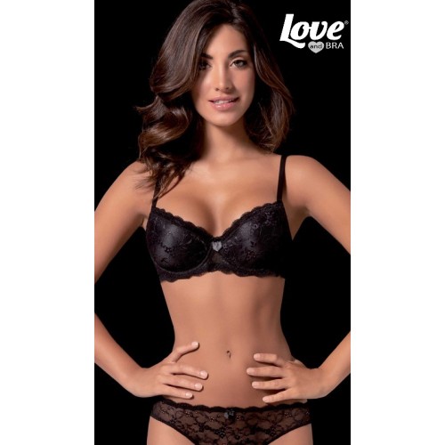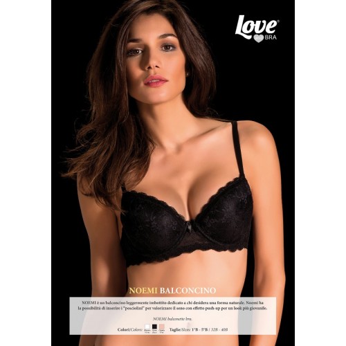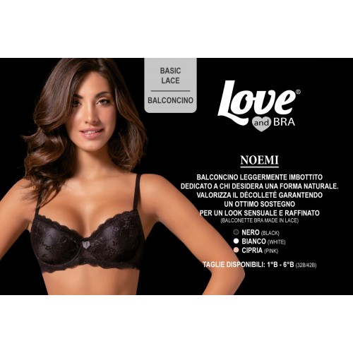 "Love&bra modello Noemi" è un reggiseno Balconcino con ferretto, che ha una meravigliosa vestibilità grazie alla sue coppe leggermente imbottite, il quale da al seno di chi lo indossa una forma naturale; è realizzato interamente in pizzo e la sua composizione è in morbida microfibra.