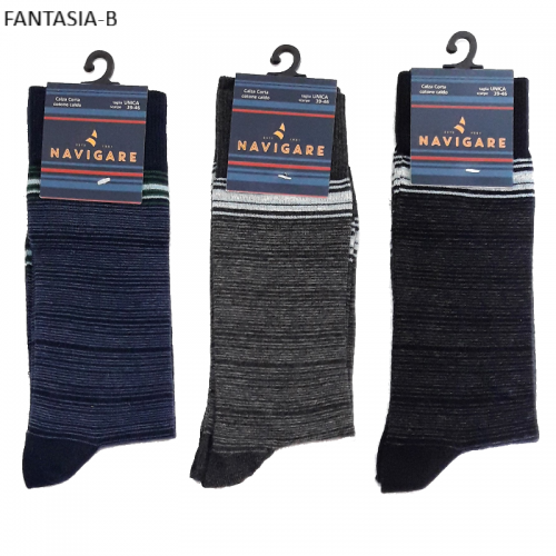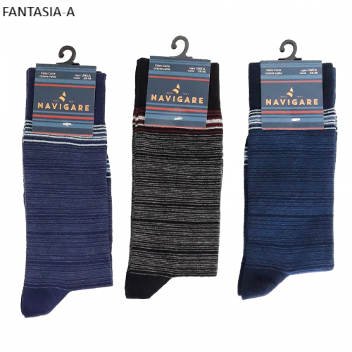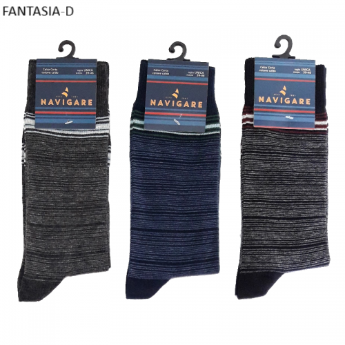 " Navigare ART.E12011 " sono un gruppo di calze corte meta polpaccio da uomo in caldo cotone a fantasia righe assortite di colori. Queste calze sono prodotte con filati di cotone di altissima qualità, caratterizzate dal loro elastico svoltato internamente morbido e resistente. Sono molto pratiche da indossare e danno un senso di confort al piede il quale viene tenuto caldo nelle stagioni rigide e fredde.