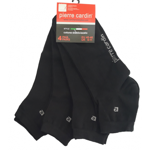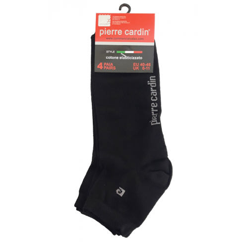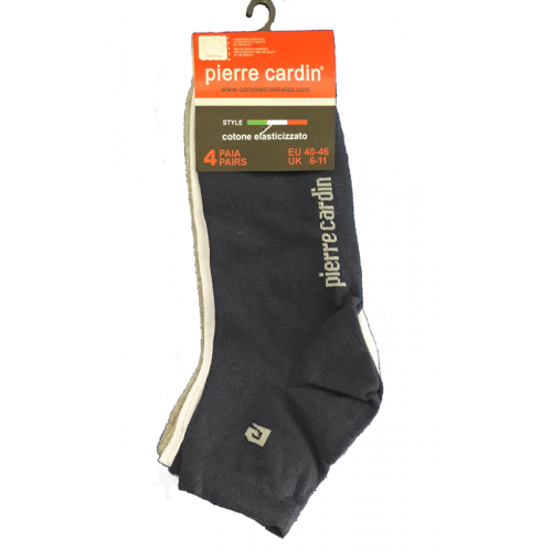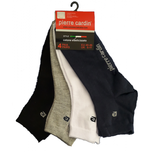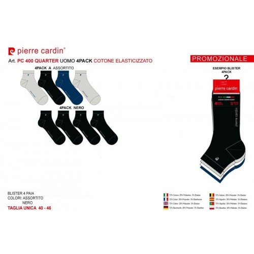 " Pierre Cardin ART.PC 400 " è un Quarter (Calzino) caratterizzato dal un piccolossimo logo a forma di "P" sull' elastico che simboleggiare il marchio Pierre Cardin e dalla sua scritta per intero sulla pianta del piede.Questo calzino è in cotone elasticizzato spugnoso ideale per chi fa dello sport cosi che assorbe il sudore del piede.la sua confezzionatura e formata da 4 calzini di colori diversi.