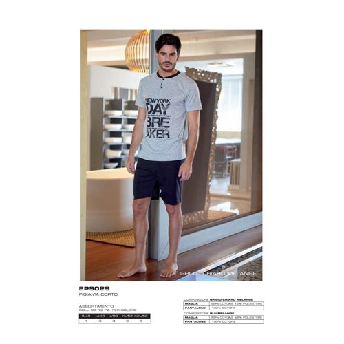 " Enrico Coveri Art.EP9029 " è un Pigaima uomo della linea Homewear composto da una maglietta maniche corte a fantasia con allo scollo due bottoncini e da un pantaloncino in tinta unita, il tutto realizzato con tessuti di altissima qualità.