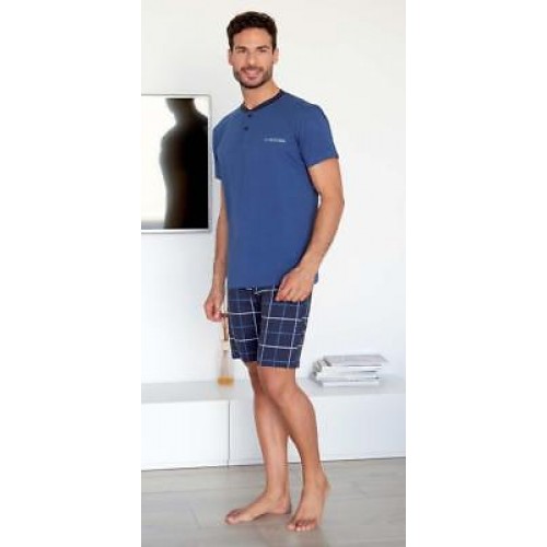 " Granchio Art.GP726 " è un Raffinato pigaima da uomo in cotone della linea granchio primavera/estate composto da una maglia maniche corte, a serafino con 2 bottoncini,di colore Jeans con colletto e bottoncini di colore blu a contarsto e da un pantaloncino corto, di colore blu a fantasia scozzese con elastico in vita, il tutto realizzato con tessuti di altissima qualità. Ottimo rapporto qualità prezzo!