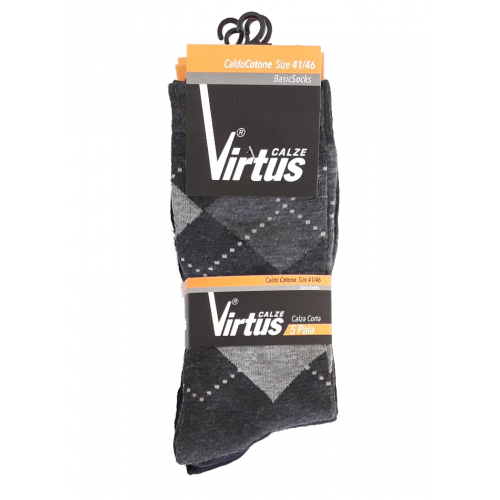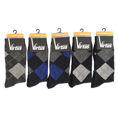 " Virtus ART.V37 ROMBO " sono un gruppo di calze corte meta polpaccio da uomo linea basic socks in caldo cotone a fantasia Rombi assortite di colori. Queste calze sono prodotte con filati di cotone di altissima qualità, caratterizzate dal loro elastico svoltato internamente morbido e resistente. Sono molto pratiche da indossare e danno un senso di confort al piede il quale viene tenuto caldo nelle stagioni rigide e fredde.
